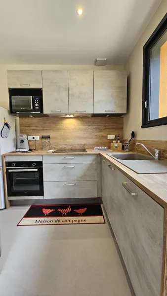 - 1 cuisine entièrement équipée (four, plaques, micro-ondes, cafetière, lave-vaisselle, ..) pour préparer vos repas comme à la maison.