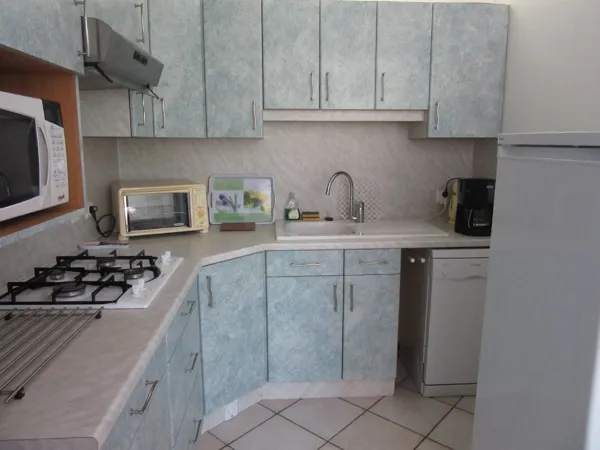 2 chambres : 1 chambre avec un lit 140, 1 chambre avec 2 lits 90 + 1 lit tiroir sous 1 lit. Salle d'eau avec douche. WC séparé. Cuisine intégrée : lave-vaisselle, plaque à induction 3 feux, micro-ondes, frigidaire, mini four.