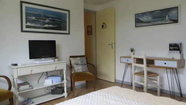 Light and spacious room (no smoking) which can accommodate 3 people (1 queen-size bed, 1 single bed). Independent entrance. Private shower room (washbasin, WC, shower). Ground floor.