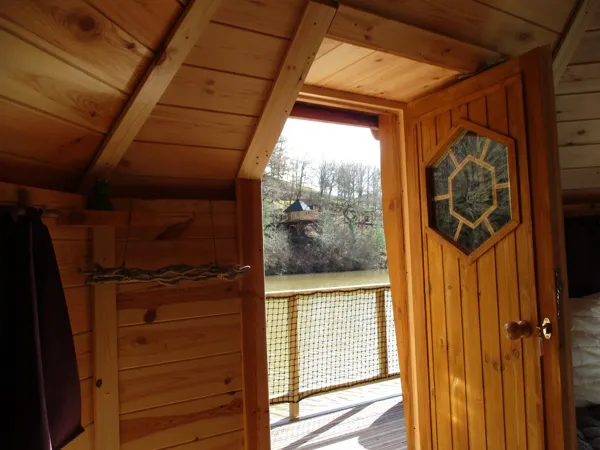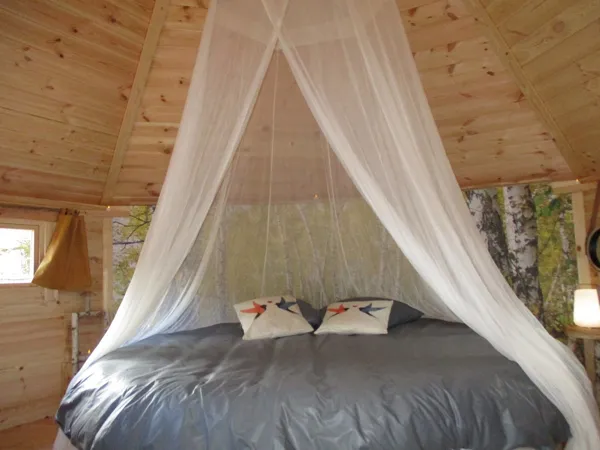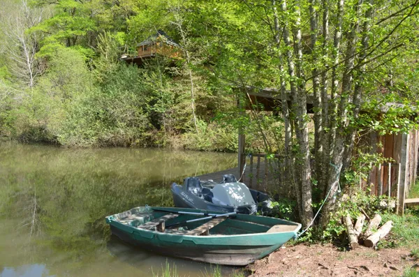 Location à la nuit, week-end, semaine dans deux cabanes insolites : l'Hirondelle perchée sur ses pilotis avec son lit rond, et Libellule sur son radeau flottant.