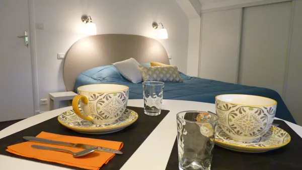 Dans maison contemporaine, charmante chambre de 2 pers, équipée de micro-ondes, frigo, cafetières, bouilloire