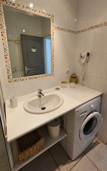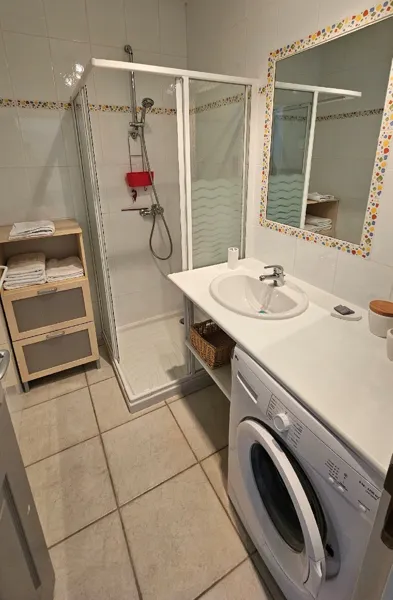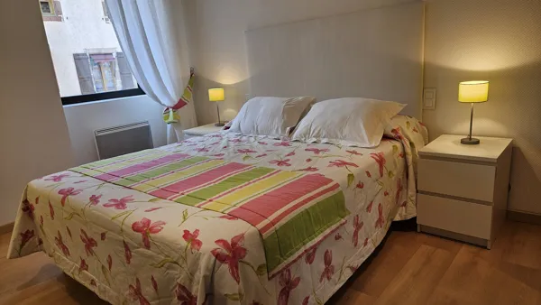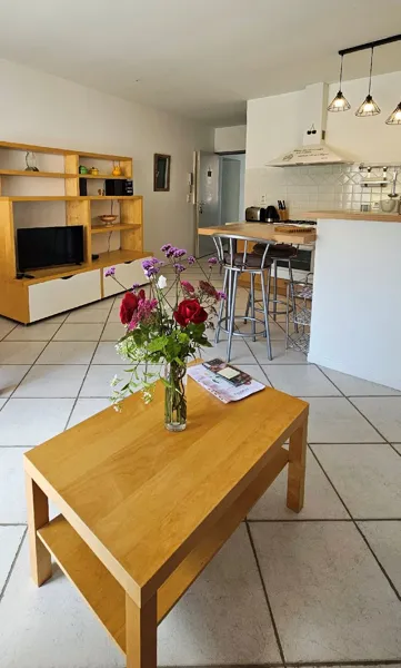 L'appartement dispose d'un séjour ouvert sur la cuisine toute équipée donnant sur la terrasse privative et le jardin partagé de plain pied. Il dispose également d'une chambre avec un lit 160x200, d'une salle d'eau et de WC séparés.