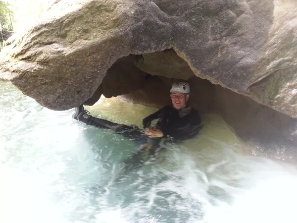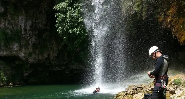 Randonnée les pieds dans l'eau en famille à partir de 8 ans. Petite promenade sportive et humide avec des petits sauts et parfois de la nage. Matériel fourni : combinaison et casque. Durée 1h30 à 2h.