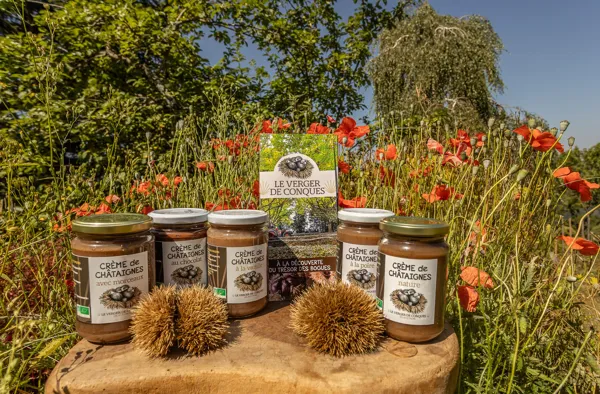 Le Verger de Conques vous propose toute une gamme de produits autour de la châtaignes : crème, marrons au naturel, farine, brisures.