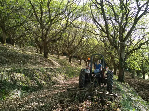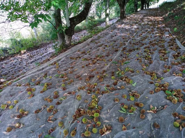 La châtaigneraie et les récoltes sont conduites et certifiées en Agriculture Biologique : nettoyage des allées par la herse et les brebis, pose de filets, récolte et tri à l'aide d'un aspirateur et d'une calibreuse.