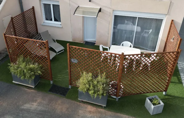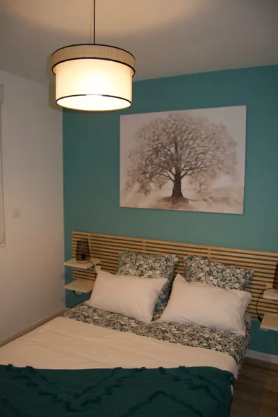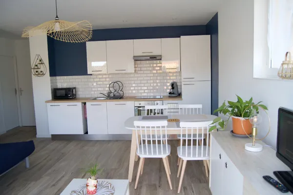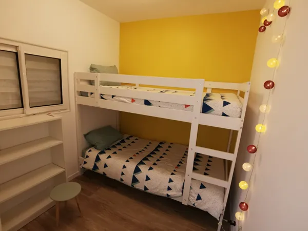 Cet appartement (Gite 3 étoiles) comprend 2 chambres (1 grand lit et 2 lits superposés), une cuisine entièrement équipée, un coin salon avec canapé convertible (2 places), 1 salle de bain équipée d'une douche, des toilettes séparées, une télévision, une connexion wifi (fibre). Un équipement bébé est fourni (lit parapluie, chaise haute, baignoire). Cet hébergement dispose d'une terrasse avec salon de jardin et chaises longues.
