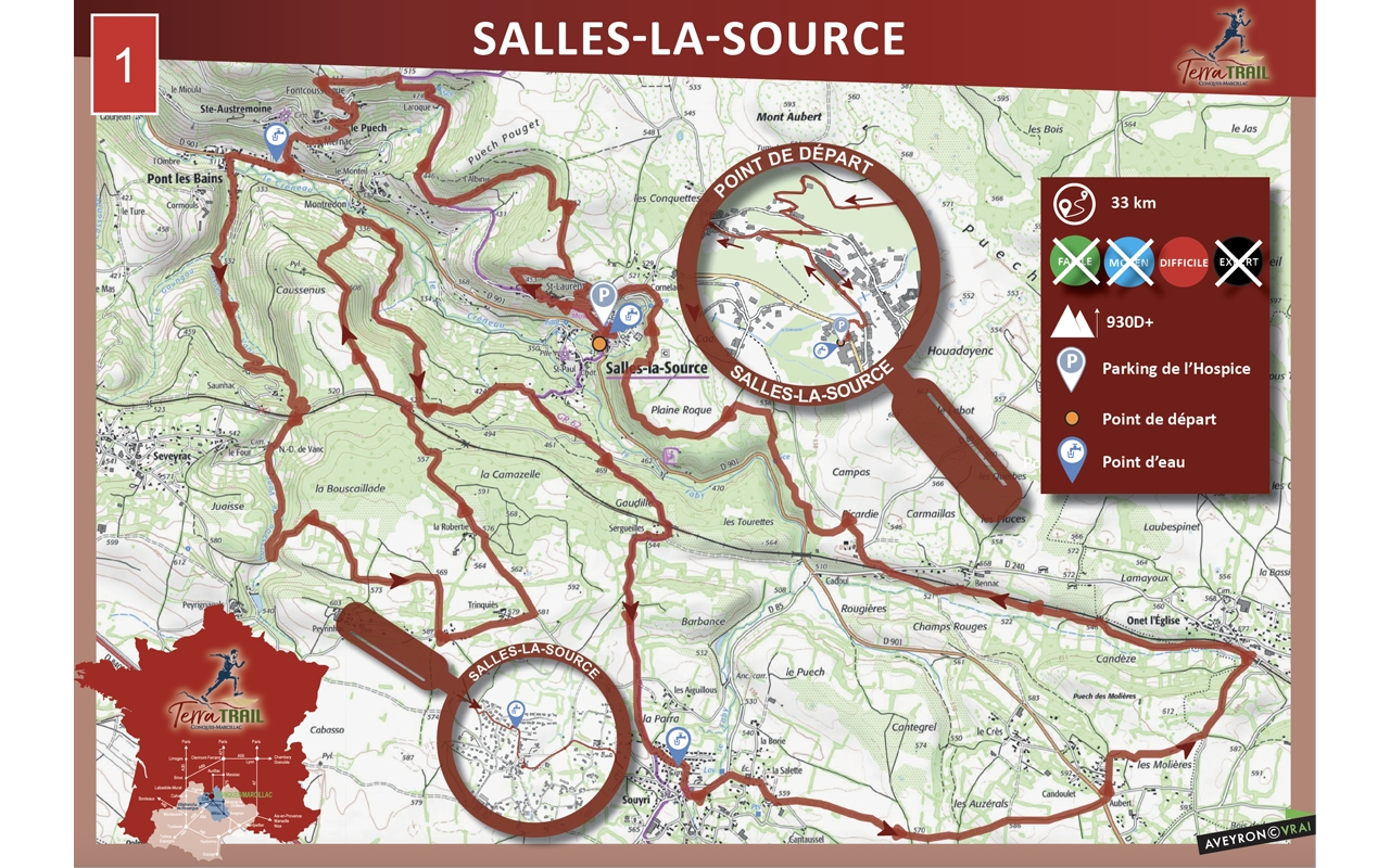 Parcours que l'on pourrait découper en 2 parties. Une première partie composée d'une alternance de montées-descentes assez franches, mais que l'on encaisse très bien, grâce à la beauté et à la qualité des sentiers sur les corniches, sur la cascade de La Roques, et la descente jusqu'à la vallée. Ensuite vous allez longer un ruisseau lors d'une longue côte en 3 parties, mais de plus en plus belle au fur et à mesure que l'on avance. Un moment de répit pour dérouler sur le Causse, avant d'emprunter un descente bien raide et remonter par un petit sentier caillouteux, souvent à l'ombre. Passages vallonnés en sous-bois, avant de remonter sur Souyri. A cet endroit, vous pourrez recharger de l'eau au cimetière. Vous venez d'absorber le gros du dénivelé sur cette première partie. A partir de là, il vous faudra retrouver votre foulée pour parcourir les longues pistes, puis sentiers, jusqu'à atteindre les corniches de Salles-La-Source, sur lesquelles vous serez obligé d'admirer la vue, avant de redescendre sur le village.
