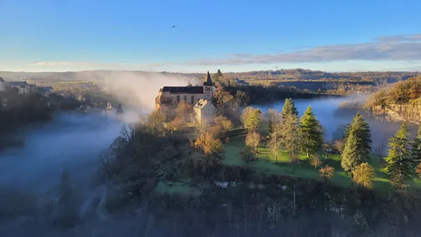 L'église Sainte Fauste est édifiée à l'extrémité d'un éperon rocheux qui domine, d'une hauteur vertigineuse, le cours du Dourdou qui décrit, à cet endroit, une large boucle. Aussi l'impression créée sur les hommes de son temps devait-elle être saisissante.
